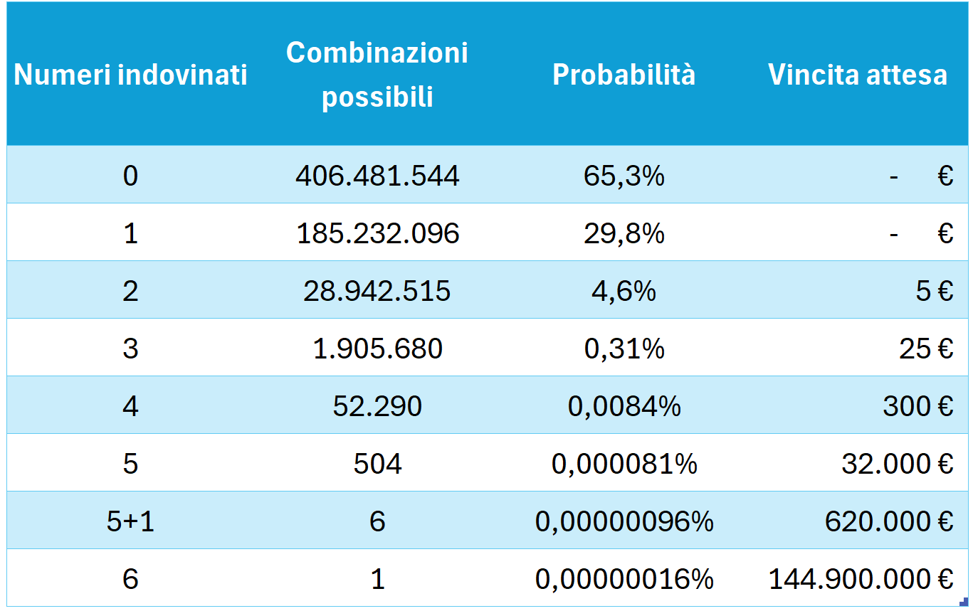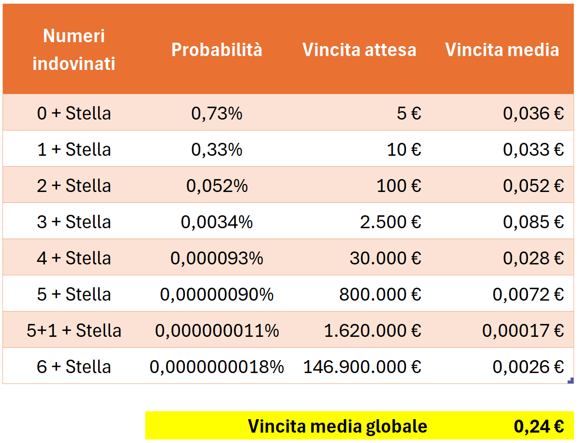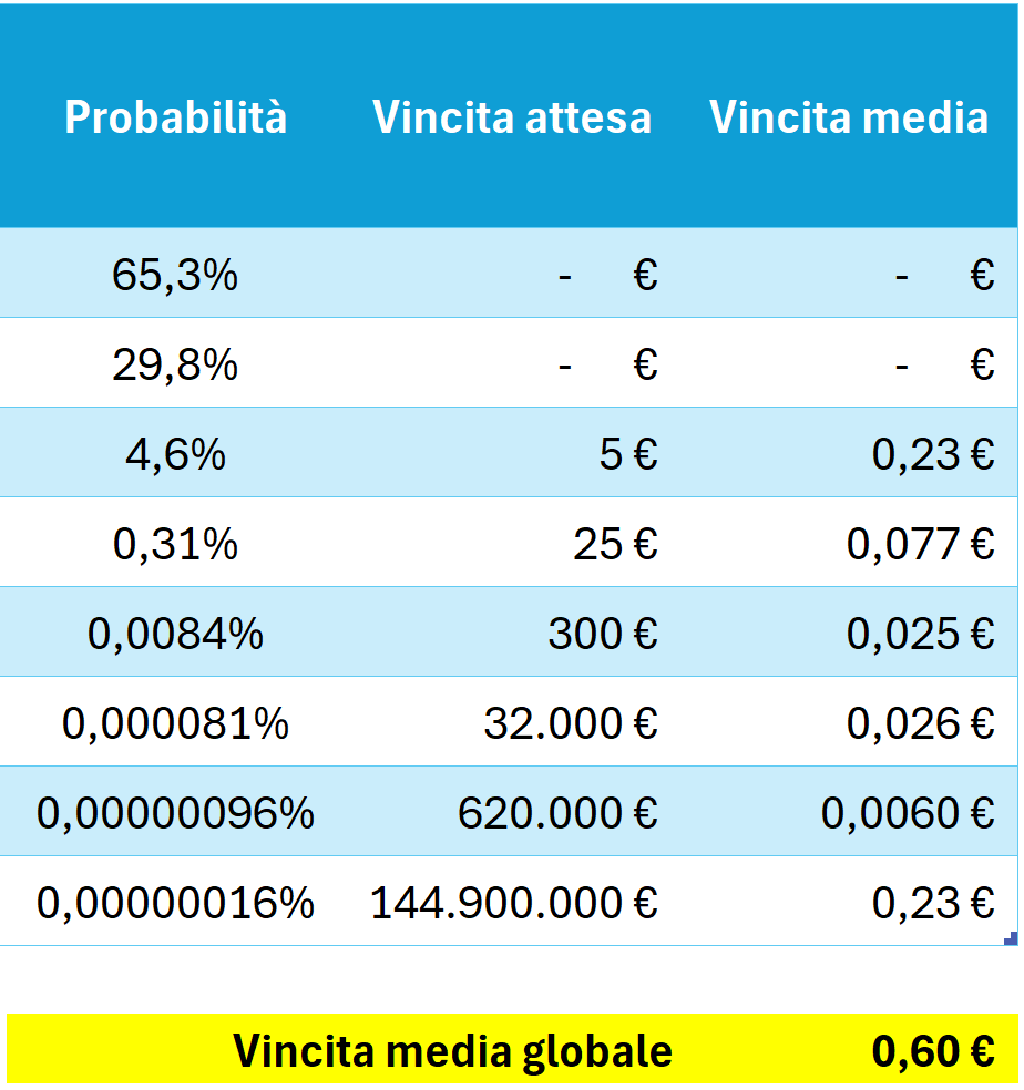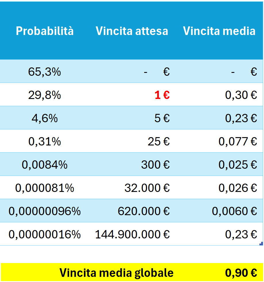 Se moltiplichiamo la vincita attesa per la probabilità, otteniamo la vincita media di ogni categoria. Infine, se sommiamo la vincita media di ogni categoria, otteniamo il dato più importante: la vincita media globale.