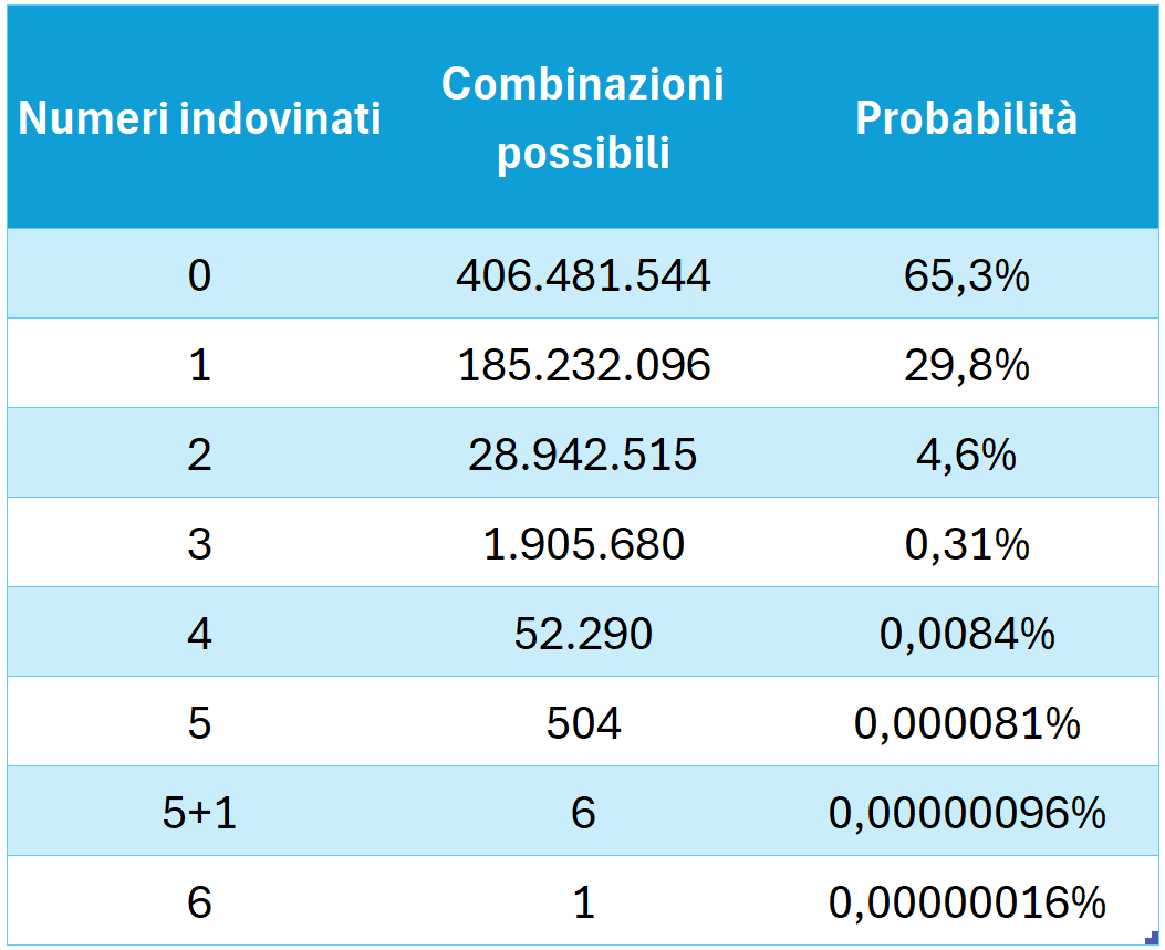 Nella versione liscia (senza SuperStar), si può vincere indovinando 2, 3, 4, 5, 5+1 e 6 numeri. Calcoliamo le probabilità di tutti questi casi partendo dall’ipotesi di indovinare 2 numeri su 6 (questi calcoli sono già resi disponibili dal sito di Sisal, che generosi).